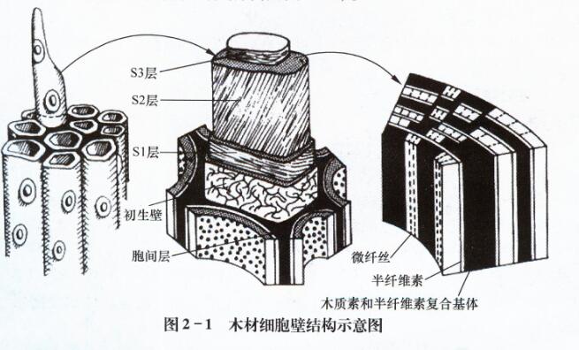 木材是由無數(shù)細胞構成的,根據(jù)它們在木材中的位置、機能和生理作用不同,木材的細胞分為厚壁細胞和薄壁細胞。其中,起增進機械強度功能的是厚壁細胞,如針葉材的管胞、闊葉材的木纖維,這些細胞細長、壁厚、腔窄、兩端較小,通稱為纖維細胞(簡稱纖維)。纖維細胞決定著木材及其制品的機械強度,是影響刨花板質量的主要因素之一。除纖維以外的細胞稱為“雜細胞”,如木材的木射線、薄壁細胞等,這些細胞壁薄、短小、切削加工時易碎,因此,“雜細胞"含量高的原料質量較差。細胞壁是木材的實質部分,是植物所特有的一種結構(見圖2-1)。