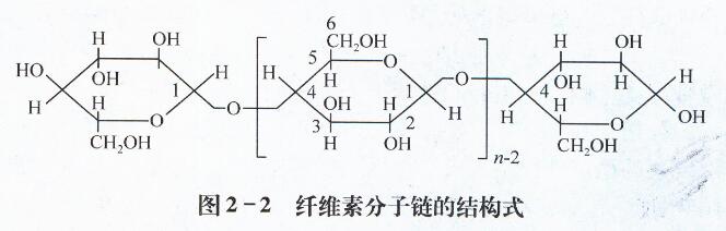①纖維素:纖維素是不溶于水的簡單聚糖,是由大量的D葡萄糖基彼此通過1,4位碳原子上的β糖苷鍵連接而成的直鏈巨分子化合物,具有特殊的x射線圖。纖維素的分子式可用(C6H10O5)n。表示,式中C6H10O5為葡萄糖基,n為聚合度。天然狀態(tài)下的棉、麻及木纖維素,n近于10000。纖維素分子鏈的結構式如圖2-2所示。