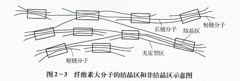 纖維素是木材細胞壁中“骨架”物質,主要為木材提供強度。纖維素纖維的物理結構中,存在著由纖維索分子鏈高度整齊排列的結晶區(qū)部分和排列不整齊的非結晶區(qū)(無定型區(qū))部分(見圖2-3)。兩者沒有明顯的界限,但有相對的過渡。纖維素的無定型區(qū)有大量的游離羥基存在,羥基具有很性,能吸附很性水分子,形成氫鍵,因此,纖維素的無定型區(qū)具有吸濕性,結晶區(qū)則沒有。纖維素吸濕后,水分子會進人無定型區(qū),與纖維素分子鏈的羥基形成氫鍵結合,使纖維素分子鏈間的距離增大,宏觀上反映為木材膨脹。纖維素無定型區(qū)所占的百分比越大,吸濕性就越大,會影響制品的物理力學性能,因此,選用原料和制定工藝時要從多方面加以考慮。